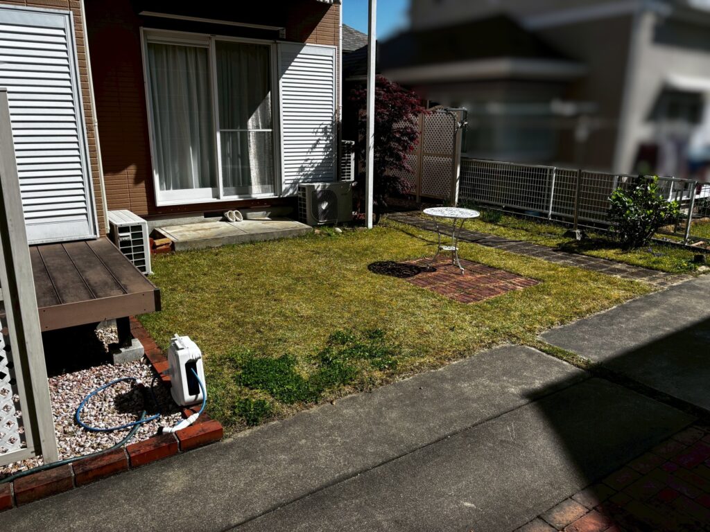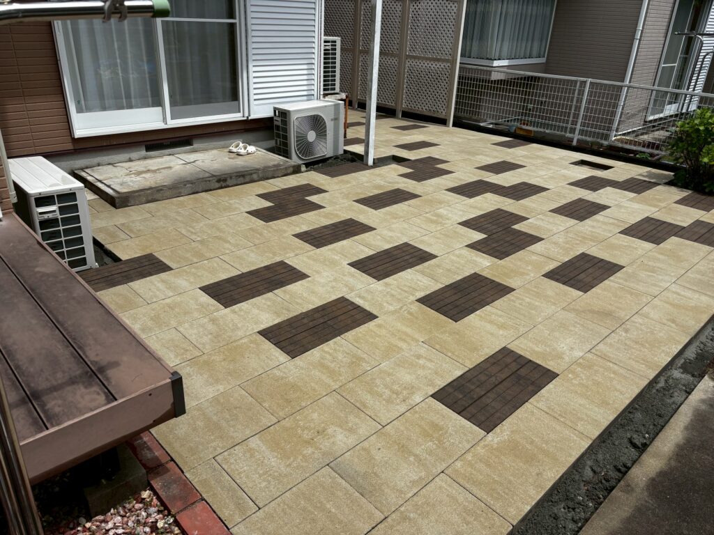 庭の芝生スペースをタイル張りへと変更しました。